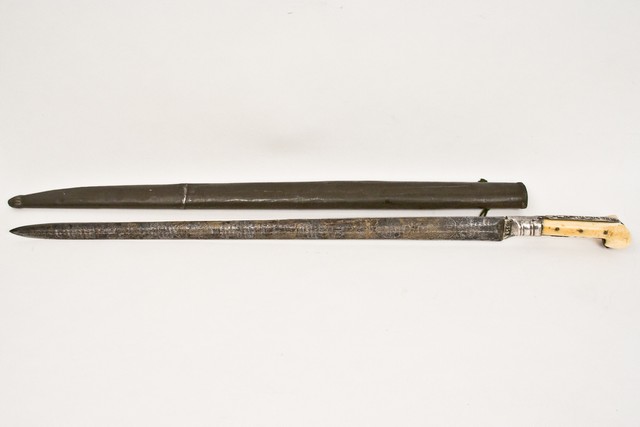 Hrvatski povijesni muzej Zbirka hladnog oružja MAČ S BALČAKOM U OBLIKU JATAGANA, sječivo: 18. st. (prva pol.); držak i korice: 1846. g. Austrija (sječivo); Osmansko Carstvo : Bosna (držak i korice). čelik, kost; kovanje, lijevanje, rezbarenje, pozlaćivanje mač: 610 : 495 : 27 mm; korice: 542 mm Inv. br.: HPM/PMH-018353