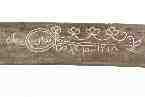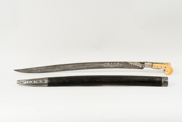 OPIS: Držak od žute kosti, s manjim usječenim ušima. Spojnica od metala ukrašena vegetabilnim ornamentom. Nastavak drška od metala s ukrasom ljusaka koje se susreću i na dijelu hrpta. Listoliki ukras na sječivu ukrašen baroknom ornamentikom. Sječivo čelično, jednobridno, zakrivljeno. S jedne strane sječiva arabički natpis, koji u prijevodu glasi: 'Godina 1218. (po Hidžri). Izradio Mehmed, vlasnik Ali baša'. Korice drvene, presvučene većim dijelom u kožu, a na ustima i vršku okovane metalom. Pronađeno u Bosni. Darovao Ivan Pajlok, učitelj u Zagrebu.
