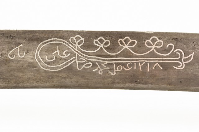 Hrvatski povijesni muzej Zbirka hladnog oružja JATAGAN BJELOSAPAC, 1803. - 1804. g. Osmansko Carstvo : Balkan. Izradio Mehmed. Izradio Ali baša. čelik, kost, drvo, koža, srebro; kovanje, rezbarenje, tauširanje, lijevanje, filigran jatagan: 690 : 565 : 33 mm; korice: 605 mm Inv. br.: HPM/PMH-000285