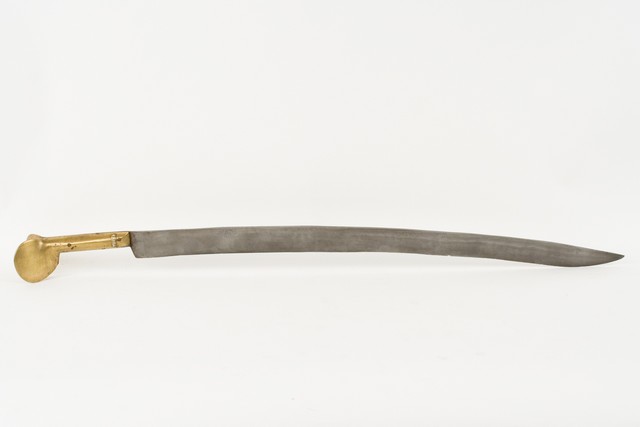 Hrvatski povijesni muzej Zbirka hladnog oružja JATAGAN S MJEDENIM DRŠKOM, 19. st. Osmansko Carstvo : Balkan. čelik, mjed; graviranje, kovanje, lijevanje jatagan: 780 : 640 : 35 mm Inv. br.: HPM/PMH-018164