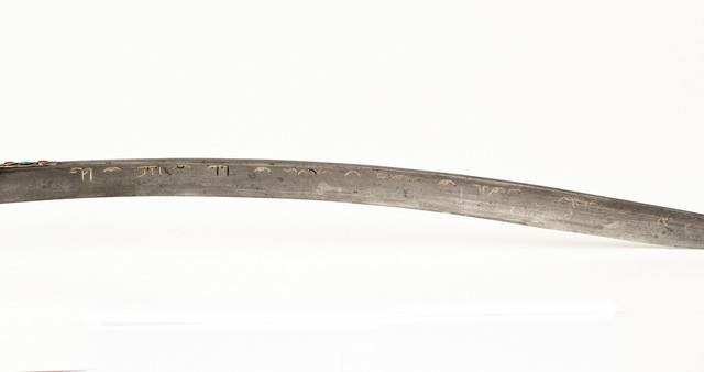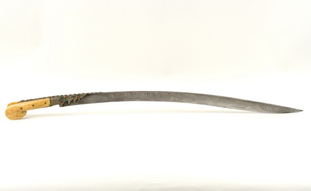 OPIS: Držak od žućkaste kosti, sa dugoljastim, polukružnim ušima. Spojnica od metala, ukrašena gustim nizom naizmjenično postavljenih dugoljastih koralja i tirkiza. Na nastavku drška, između kosih crta, gusti niz kuglica, a na listolikom ukrasu sječiva, između kuglica, naizmjenično postavljeni koralji i tirkizi. Sječivo čelično, jednobridno, zakrivljeno. S jedne strane sječiva u cijeloj duljini srebrom tauširana ornamentika, a s druge strane teško čitljiv arabički natpis s imenima sedmorice spavača pećine kod Efeza i imenom njihova psa: Yemliha, Mekselina, Meslina, Mernus, Debernus, Saznus, Kefestatayus, Kitmir. Korice nedostaju.