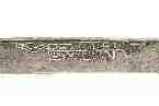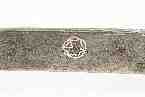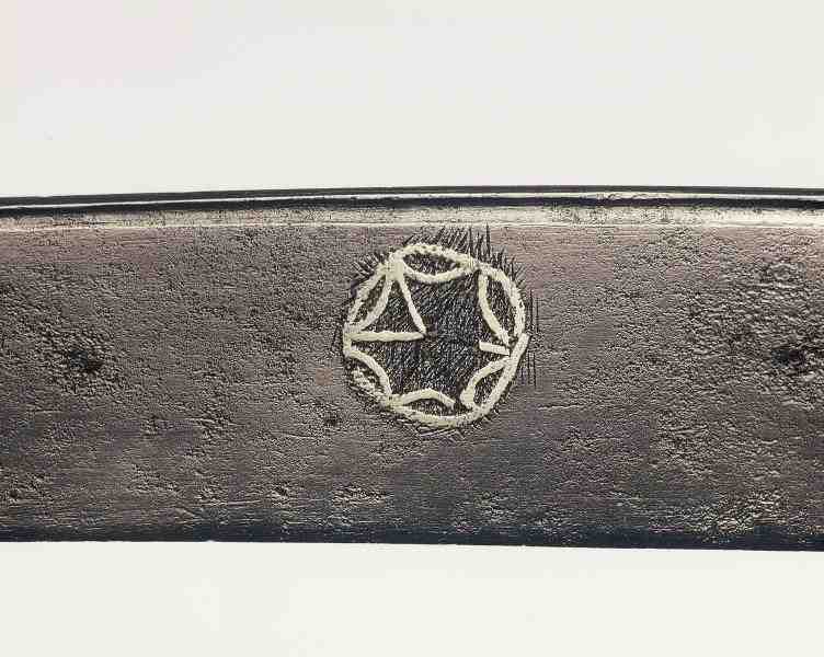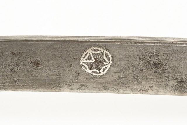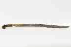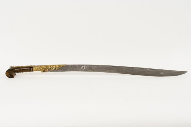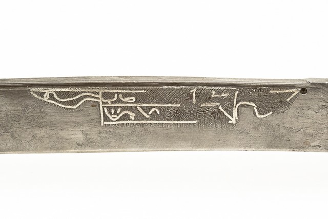 OPIS: Držak od tamne kosti, sa spojenim usječenim ušima. Spojnica od mjedi, s utisnutim vegetabilnim ornamentima. Na nastavku drška zrnati uzorak, a na listolikom dijelu utisnuta vegetabilna ornamentika. Sječivo čelično, jednobridno, zakrivljeno, s jednim uskim žlijebom uz hrbat. S jedne strane sječiva srebrom tauširana stilizirana zvijezda, a s druge strane nečitljiv arabički natpis. Korice nedostaju. Kupljeno od Milana Praunspergera u Zagrebu 1940. g. (?)