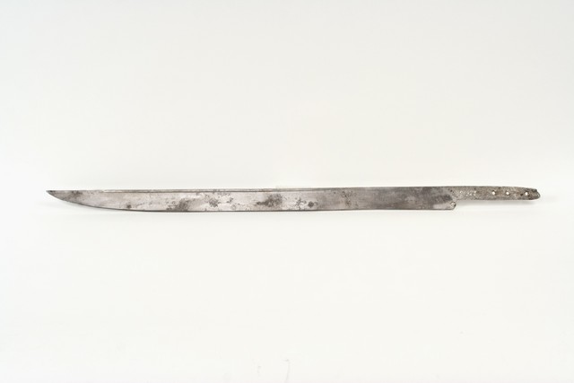 OPIS: Sječivo čelično, jednobridno, ravno, s uskim žlijebom uz hrbat. Nastavak sječiva s tri manje perforacije za učvršćivanje obloga drška. Držak i korice nedostaju.