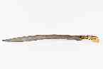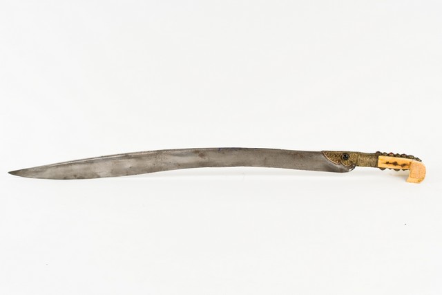 OPIS: Držak od žute kosti, s manjim, zaobljenim ušima. Spojnica od bakra, s tragovima pozlate, ukrašena filigranom i sa šest crvenih stakala. Na nastavku drška ukras filigrana s motivom kružnica. Na listolikom ukrasu sječiva ukras filigrana i po jedno zeleno stakleno oko sa svake strane. Sječivo čelično, jednobridno, zakrivljeno, s uskim žlijebom uz hrbat. Korice nedostaju. Kupljeno od Vladana Desnice iz Islama Grčkog 1948. godine.