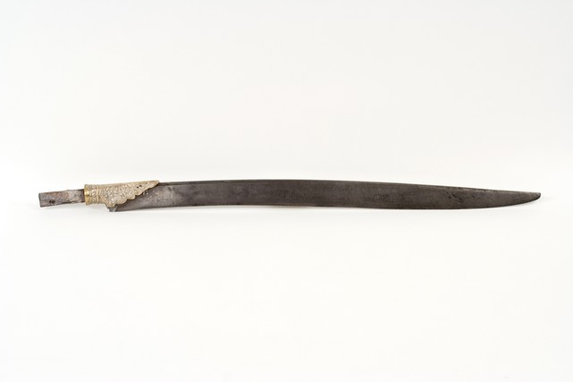 Hrvatski povijesni muzej Zbirka hladnog oružja SJEČIVO JATAGANA, 19. st. Osmansko Carstvo : Balkan. čelik, srebro; kovanje, tauširanje jatagan: 580 : 500 : 32 mm Inv. br.: HPM/PMH-002538