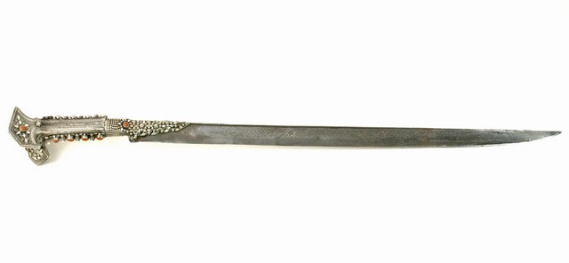 OPIS: Držak presvučen u srebro, s većim fasetiranim ušima. Na ušima ukras filigrana, sa pod dva koralja sa svake strane. Na dršku (na spojnici) ukras filigrana s 11 koraljnih zrna. Na nastavku drška ukras zrna s po jednim koraljem. Na listolikom ukrasu sječiva ukras filigranskih rozeta s romboidima. Sječivo čelično, jednobridno, ravno, s uskim žlijebom uz hrbat. Po cijeloj duljini sječiva srebrom tauširana vegetabilno-linearna ornamentika s obje strane. Na jednoj strani u ornamentiku uklopljen kratki arabički natpis, koji u prijevodu glasi: 'Uradio Salih, vlasnik Osman' i '1234. (godina po Hidžri)'. Korice drvene, jednostavne, oštećene. Kupljeno od Mare Schwarz, Zagreb, 1982. godine. Pripadalo Zbirci Dragutina Schwarza.