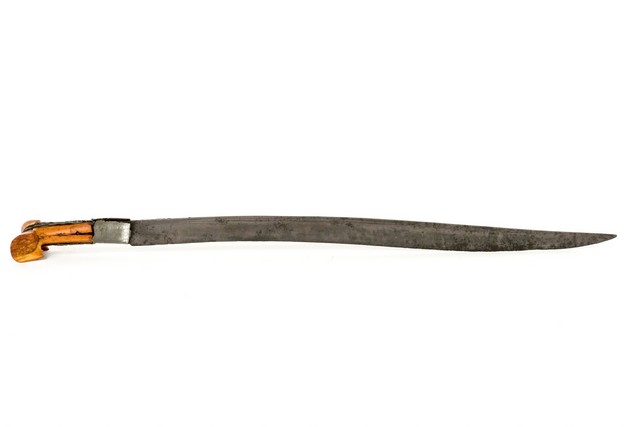 OPIS: Držak sa žućkastosmeđim koštanim oblogama, oblikovanim kao manje zaobljene uši. Spojnica drška s baroknom ornamentikom. Limeni nastavak drška napravljen naknadno. Sječivo jednobridno, zakrivljeno, s dva uska žlijeba uz hrbat.